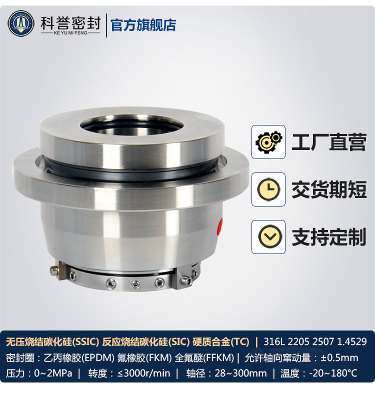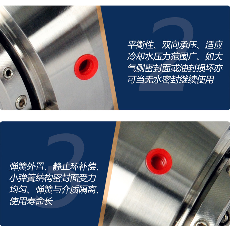 弹簧外置、静止环补偿、小弹簧结构密封面受力均匀、弹簧与介质隔离、使用寿命长